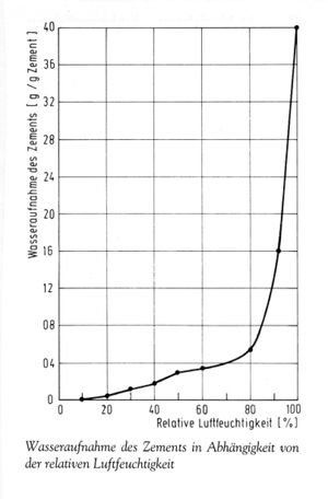 Versuche des amerikanischen Zement-Chemikers T. C. Powers zeigten, dass Zement sechs Monate gelagert in Luft mit einer relativen Luftfeuchte bis zu 50 % schüttfähig blieb und bei etwa 70 % klumpig wurde. Erhöhte sich der Feuchtegehalt auf mindestens 80 %, kam es plötzlich zu einer Wasseraufnahme, die zu einem schnellen Erhärten des Zements führte. Diese Erkenntnisse setzte Powers in ein Diagramm um.
