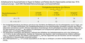Notwendige Zeitspannen zwischen dem Betonieren und dem Entfernen der Schalung (Ausschalen) gemessen in Tagen. Das DBV-Merkblatt "Betonschalungen und Ausschalfristen" gibt Anhaltswerte.