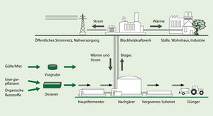 Hauptquelle für diese organischen Stoffe (Biomasse) war bisher in der Regel Gülle aus der landwirtschaftlichen Tierhaltung und Tierproduktion. Zunehmend werden für die Biogaserzeugung aber auch speziell zu diesem Zweck angebaute nachwachsende Rohstoffe wie Mais verwendet und Reststoffe aus dem landwirtschaftlichen Betriebskreislauf wie Festmist, Stroh, Rübenblatt, Gemüseabfälle oder Grüngut eingesetzt. Die Mitvergärung anderer organischer Stoffe wie z. B. von Reststoffen der Lebensmittelindustrie wird als Cofermentation bezeichnet.