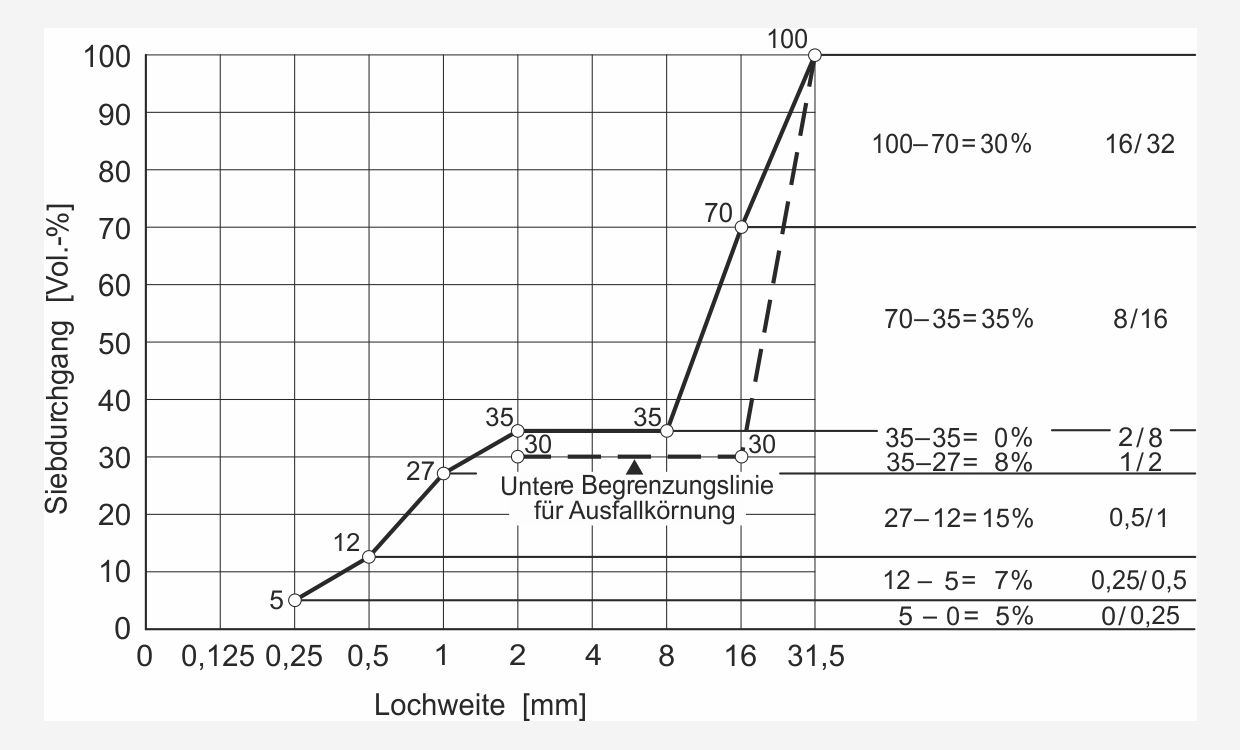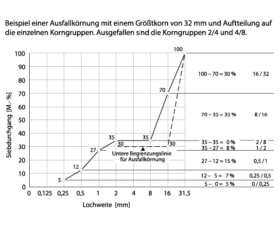 Beispiel einer Ausfallkörnung mit einem Größtkorn von 32 mm und Aufteilung auf die einzelnen Korngruppen