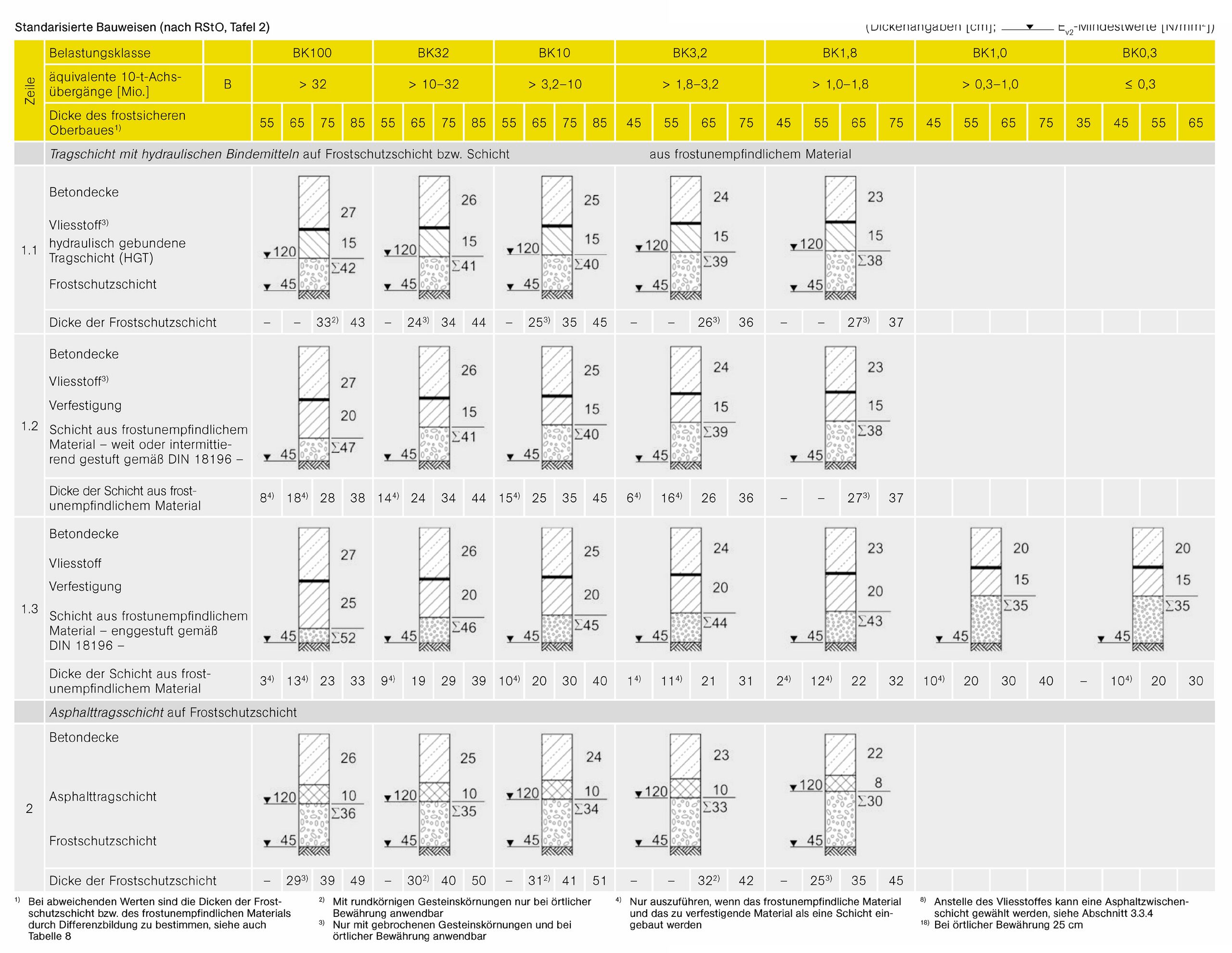 Standardisierte Bauweisen (nach RStO 2012, Tafel 2) Quelle: Oesterheld, R.; Peck, M. ; Villaret, S.: Straßenbau heute Heft 1: Betondecken. Verlag Bau+Technik, Düsseldorf 2018