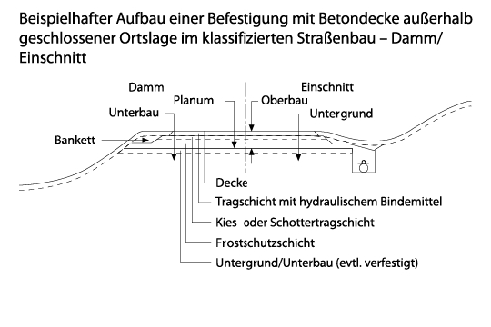 Beispielhafter Aufbau einer Befestigung mit Betondecke außerhalb geschlossener Ortslage im klassifizierten Straßenbau – Damm/Einschnitt