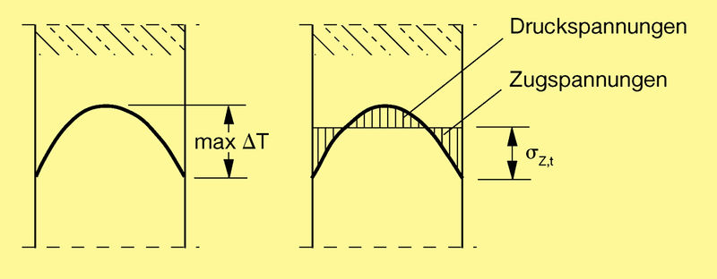 Beispielhafte Temperatur- und Eigenspannungsverteilungen infolge eines Temperaturunterschieds ΔT zwischen Betonbauteilinnerem und Bauteiloberfläche