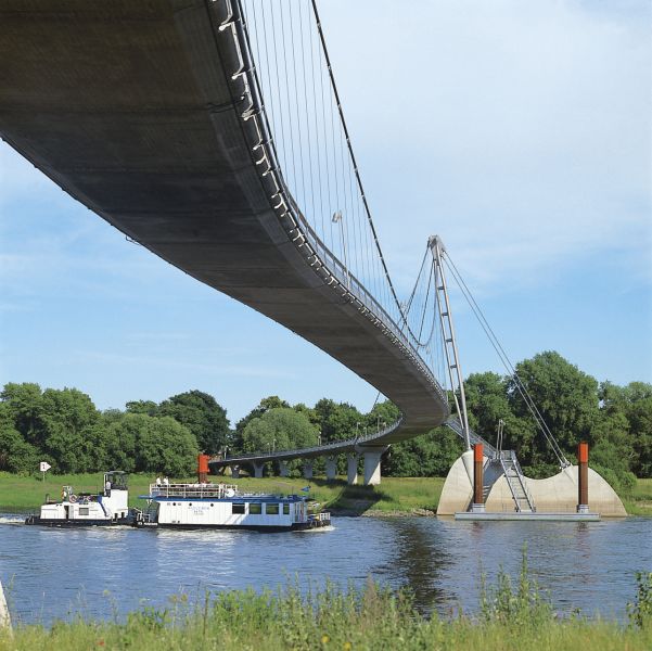Radwegbrücke "Elbsteg" zur Bundesgartenschau 1999 in Magdeburg. Im Strombereich als Hängebrücke aus Spannbeton mit Stegplatte als Betonfertigteile