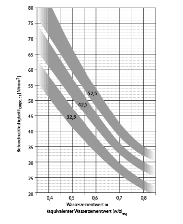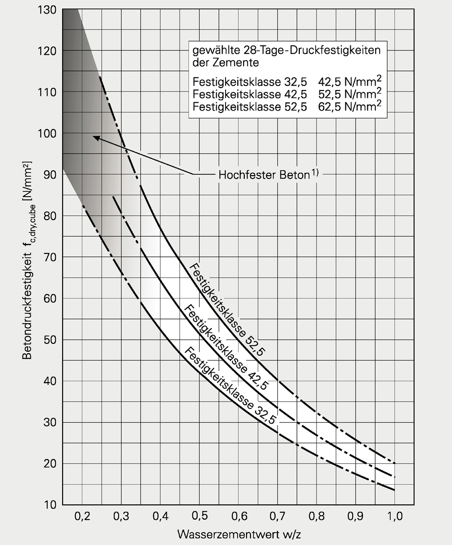 Zusammenhang zwischen Betondruckfestigkeit, Normdruckfestigkeit des Zements und Wasserzementwert ("modernisierte" Walzkurve)