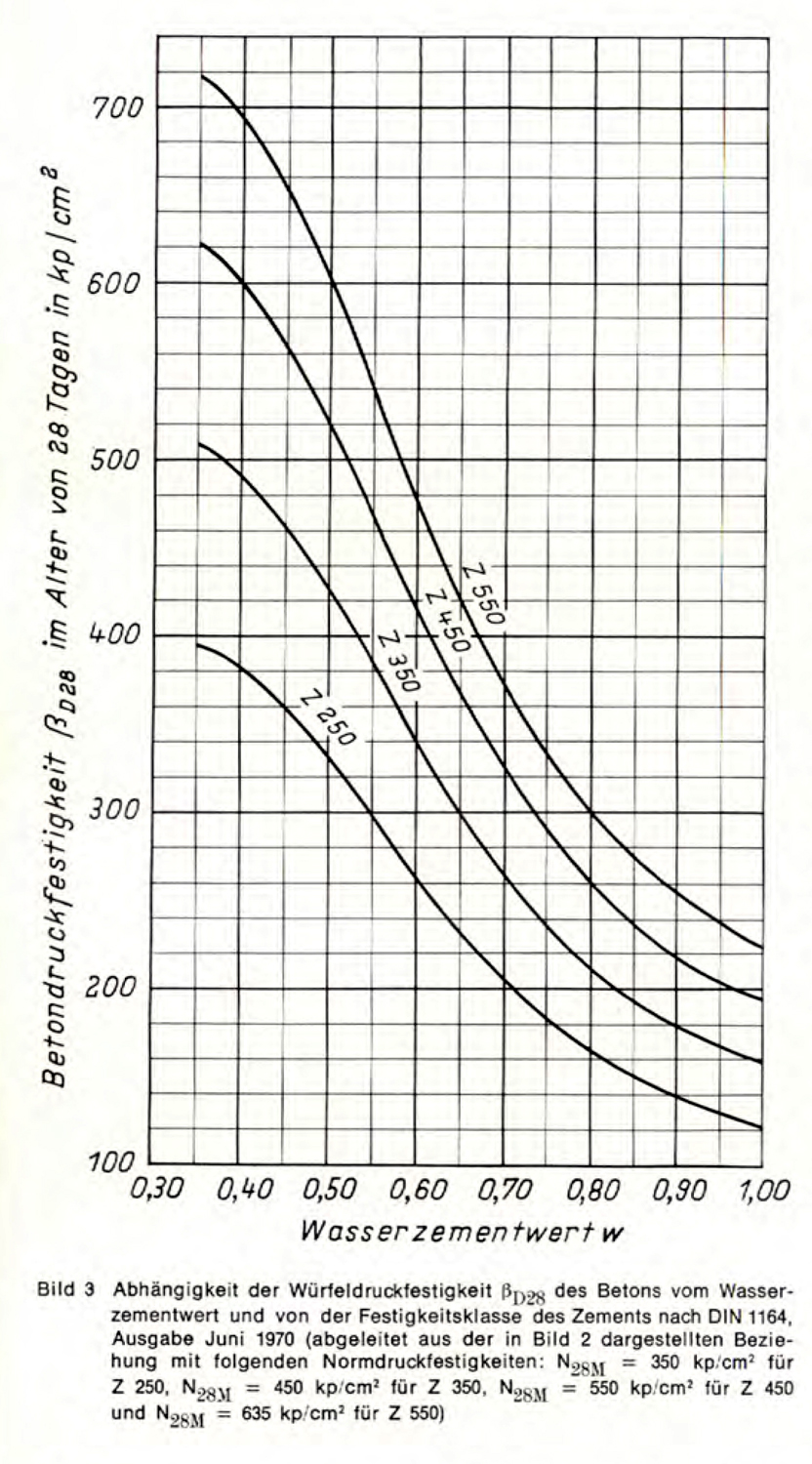 Quelle: Walz, Kurt: Beziehung zwischen Wasserzementwert, Normfestigkeit des Zements (DIN 1164, Juni 1970) und Betondruckfestigkeit. In beton 11-1970, S. 499 - 503