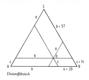 Beton und Mörtel wurden in der Vergangenheit als reines Dreistoffsystem aus Zement, Wasser und Gesteinskörnung betrachtet. Aufgrund der hinzugekommenen Betonausgangsstoffe (Betonzusatzmittel, Betonzusatzstoffe) betrachtet man heute Beton und Mörtel als Fünfstoffsystem. Für die grafische Darstellung von Dreistoffsystemen wird ein gleichseitiges Dreieck benutzt, an dessen drei Ecken die reinen Stoffe lokalisiert sind. Während die drei Seiten des Dreiecks den drei Zweistoffsystemen A-B, B-C und A-C entsprechen, werden durch die inneren Punkte des Dreiecks alle möglichen Kombinationen aus A, B und C dargestellt. Man ermittelt den einem System aus a % des Stoffs A, aus b % des Stoffs B und c % des Stoffs C zugeordneten Punkt als Schnittpunkt dreier Parallelen zu den Dreieckseiten, die in den Abständen a, b und c gezogen sind, z. B. 29 % A, 57 % B und 14 % C.
