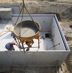 Nach dem Aufstellen der geschosshohen Doppelwandelemente auf der Baustelle wird der Raum zwischen den beiden Fertigplatten mit Transportbeton verfüllt.