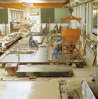 In einem Betonfertigteilwerk werden Bauteile aus Beton, Stahlbeton oder Spannbeton entweder als Produkt oder auf Bestellung entsprechend der Vorgaben der Auftraggeber industriell gefertigt, anschließend mit Transportfahrzeugen zur Baustelle transportiert und dort, z. B. mit einem Kran, in ihre endgültige Lage versetzt. Im Fertigteilwerk erfolgt die Fertigung witterungsunabhängig. Die im Werk vorgehaltenen Anlagen ermöglichen das Erfüllen höchster Qualitätsansprüche.