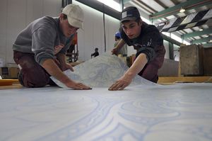 Dies erfordert eine sehr genaue, mechanisierte Dosierung des Oberflächenverzögerers auf eine Trägerfolie. Das Verzögererprofil erzeugt aufgrund der unterschiedlichen Auftragsdicken und den daraus resultierenden Auswaschtiefen an der Betonoberfläche das ursprüngliche Bild. Die präparierte Trägerfolie wird auf die Schalung geklebt und die verzögerte Fläche nach dem Erhärten des Bauteils gewaschen.