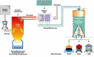 Steinkohle wird in Kraftwerken zunächst zu Kohlenstaub gemahlen und dann mit der Verbrennungsluft in den Feuerraum gefördert, wo die organischen Bestandteile der Kohle unter Wärmefreisetzung verbrannt werden. Die nichtbrennbaren mineralischen Bestandteile agglomerieren zum Teil zu gröberen Partikeln und sammeln sich in Trockenfeuerungskesseln (1100 °C bis 1300 °C) am Kesselboden als Kesselsand.