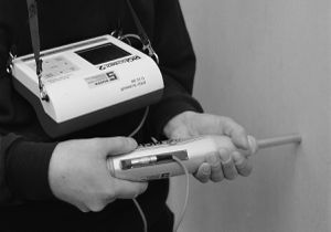 Gerät für die zerstörungsfreie Betonprüfung von Festbeton. Bei der Rückprallprüfung wird die Elastizität des Betons in oberflächennahen Schichten gemessen. Unter bestimmten Voraussetzungen kann auf die Druckfestigkeit des Betons geschlossen werden. Ein Teil der Schlagenergie wird für die Verformung des Betons, der restliche Teil für den Rückprall des Schlaggewichts verbraucht. Gemessen wird der Rückprallweg des Schlaggewichts, der Rückschlüsse auf das elastische Verhalten in oberflächennahen Schichten zulässt.