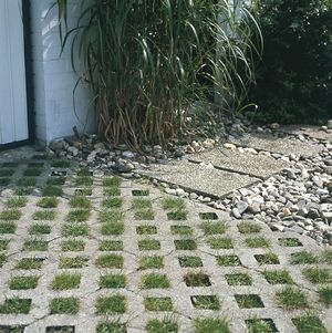 Betonsteine mit Aussparungen für eine Begrünung. Der potentielle Grünflächenanteil liegt zwischen 30 % und 62 %, in Sonderfällen bei 87 %. Anwendung: Garagenzufahrten, Parkplätze, Feuerwehrzufahrten, Grabenbefestigung