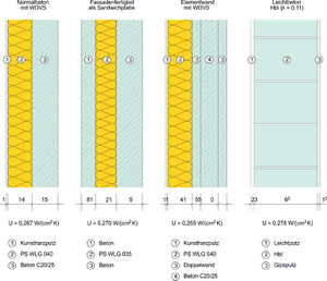 Das Gebäudeenergiegesetz schreibt auch bauteilbezogen Höchstwerte der Wärmedurchgangskoeffizienten vor. Die nebenstehende Grafik stellt beispielhaft Wandkonstruktionen aus Beton und deren U-Werte vor.