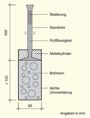 Für die Prüfung des Widerstands eines Betons (z. B. für Auffangbauwerke) gegen Eindringen wassergefährdender Flüssigkeiten werden alternative Verfahren angewendet, die in der DAfStb-Richtlinie "Betonbau beim Umgang mit wassergefährdenden Stoffen" beschrieben werden. Dazu werden z. B. Probekörper hergestellt, aus denen Bohrkerne entnommen werden. Der Bohrkern wird in die Versuchseinrichtung eingespannt und es wird ein 50 cm Standrohr auf die Bohrkernoberfläche aufgesetzt. In das Standrohr wird 40 cm hoch die wassergefährdende Flüssigkeit eingefüllt. Die Veränderung des Flüssigkeitsspiegels wird in bestimmten Zeitabständen gemessen und bewertet.