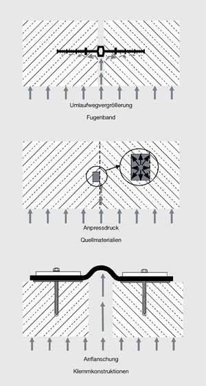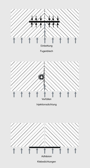 Für wasserundurchlässige Betonbauwerke sind nur Abdichtungen von Fugen von Bedeutung, die bei Wasserdruck dicht sind und trotz entsprechender Beanspruchung dicht bleiben. Zu den Abdichtungsprinzipien gehören die: