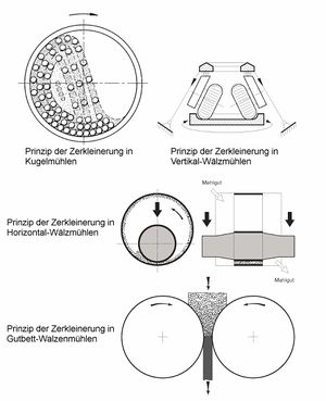 In der Kugelmühle wird das Gut zusammen mit einer Stahlkugelfüllung in einem um seine Langsachse rotierenden, innen gepanzerten Rohr umgewälzt und dabei gemahlen. In der Vertikal-Wälzmühle überrollen ortsfest angebrachte Walzen das Mahlgut auf einem sich drehenden Teller. Die Horizontal-Wälzmühle (Horomill, Horizontal Roller Mill) besteht aus einem kurzen, horizontal gelagerten Mühlenrohr, auf dessen gepanzerte Innenwand eine gepanzerte Mahlwalze hydraulisch aufgepresst wird. In der Gutbett-Walzenmühle – auch Rollenpresse genannt - wird das Gut in dem Spalt zwischen zwei gegenläufig rotierenden Walzen durch Druck zerkleinert.